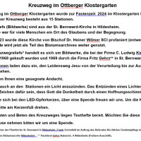 Innerhalb des denkmalgeschützten Ottberger Klostergartens soll ein neuer Kreuzweg angelegt werden. Der Kreuzweg besteht aus 15 Stationen, die bisher in der St. Bernwardkirche in Hildesheim ausgestellt sind. Diese Kirche wird in absehbarer Zeit von Bischof Dr. Heiner Wilmer profaniert (entweiht). Diese besonderen Steinreliefs sollen im Ottberger Klostergarten eine neue Heimat bekommen. Unser Ziel ist es, zu Beginn der Fastenzeit im Februar 2024 den Kreuzweg im Klostergarten aufgestellt zu haben. Für dieses Vorhaben werden 15 wetterfeste Stelen aus Holz benötigt. Der Kreuzweg ist dann während unserer Öffnungszeiten zu besichtigen. Vereine und Gruppen sind nach Fertigstellung eingeladen, bei uns im Klostergarten den Kreuzweg zu beten.